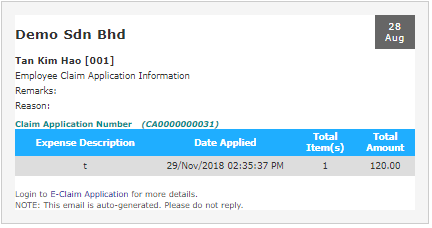 Step 4: The approving officer/immediate superior can click on the View button to find more details of the expense claim application (Expense Claim Application Detail screen).