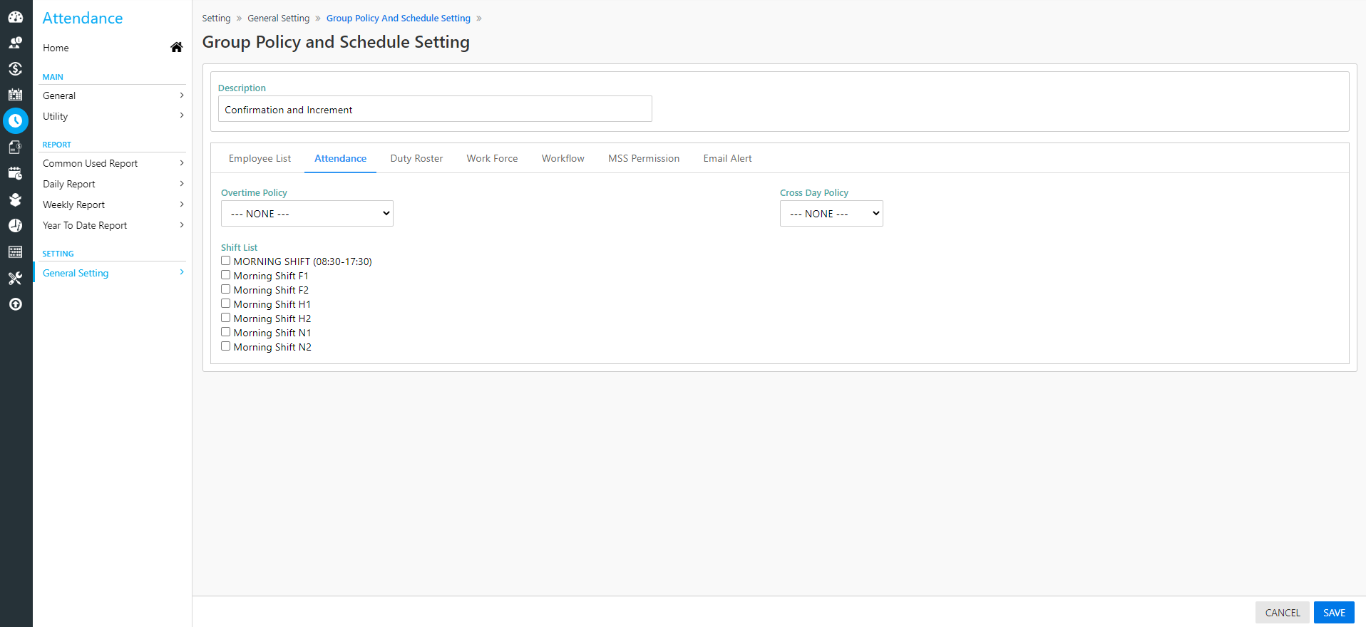 Step 1 , 2 & 3: Firstly, go to Attendance -> General Setup -> Group Policy and Schedule