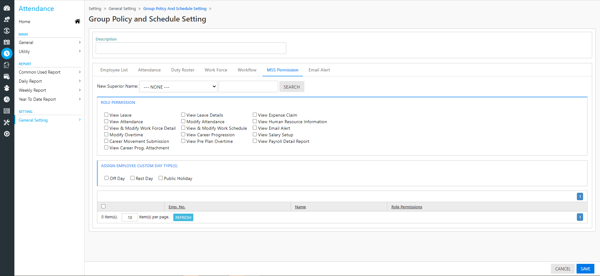 16. The 'Supervisor's Permission' tab is for you to set the Security Access Level for individual Employee by assigning them different Role Permission.