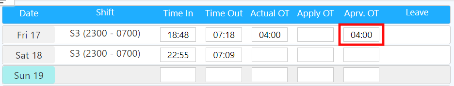 On Fri 17 as shown in the screenshot below, the system captures 4 hours of OT done by the employee based on the clocking data and the overtime policy assigned to the employee.